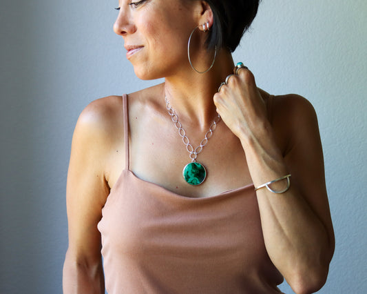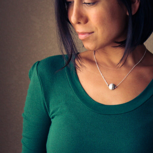 The Pilar Necklace fits perfectly around your neck line, resting at the colar bone. Simple, eye catching and comfortable.